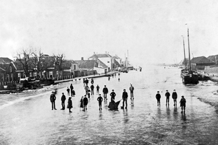 Op de achtergrond de directeurswoningen van de leerlooierij met aan de overkant van het water droogschuren van de dakpannen- en tegelfabriek D.van Oordt & Co. Links vooraan, dichter bij de Oude Rijn, liggen karakteristieke kleine dorpswoningen. Foto uit biografie Bloem : Van alle dingen los; Bart Slijper